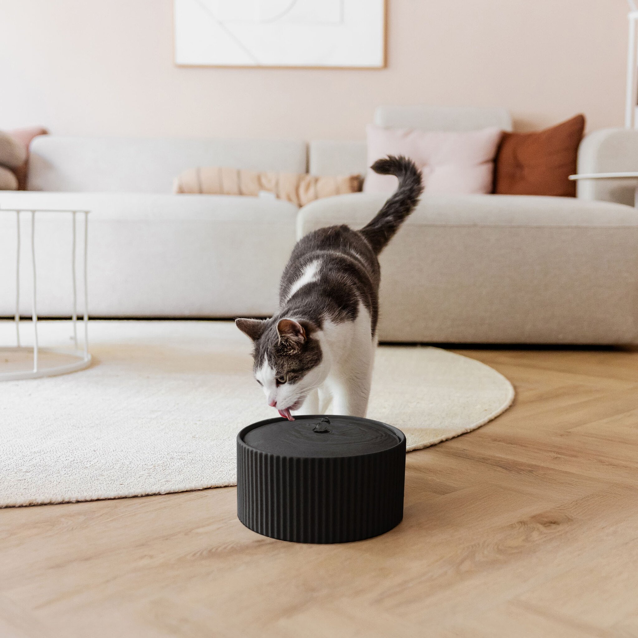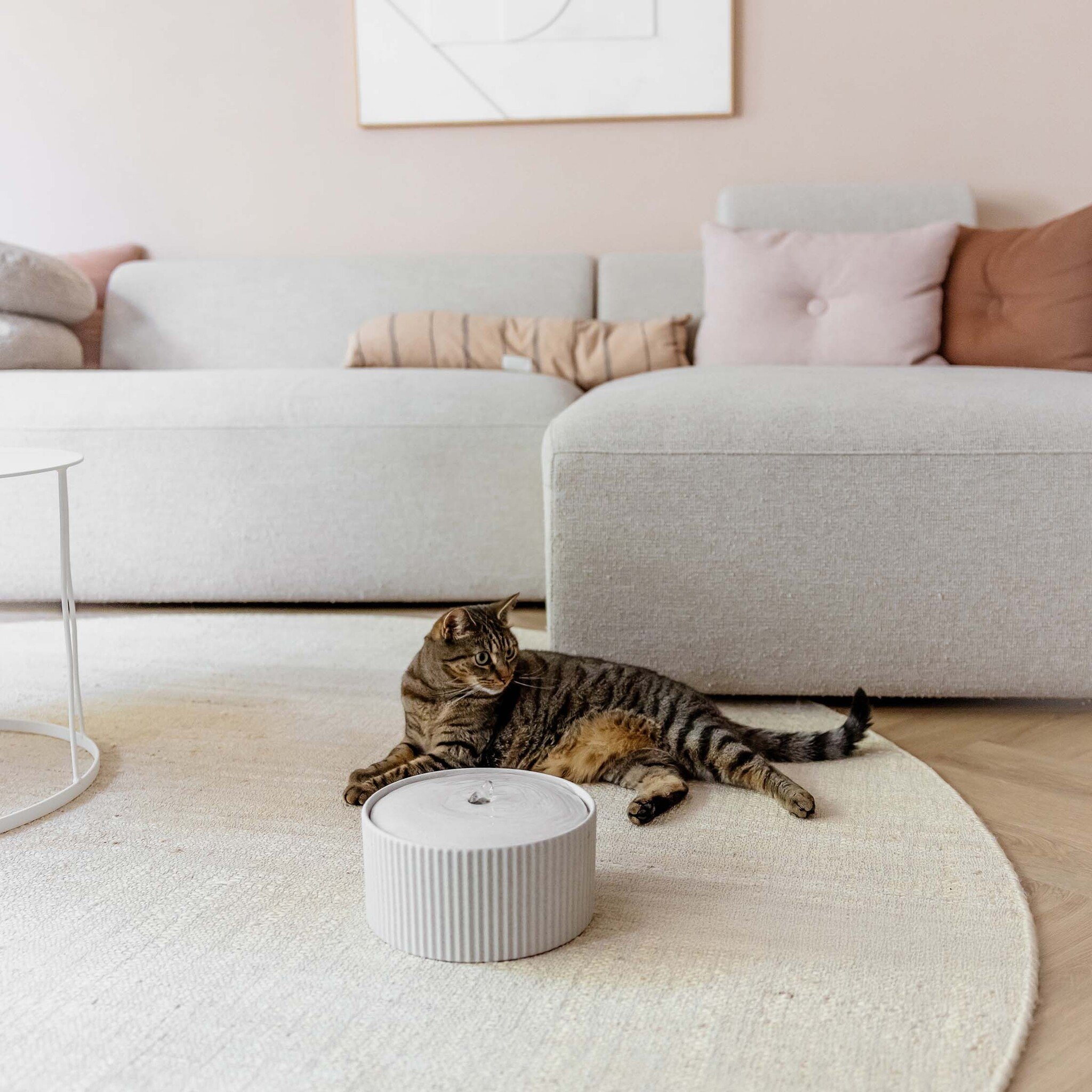 Het geribbelde keramiek geeft de fontein een ambachtelijke, bijna handgemaakte look die mooi staat in elke kamer. De rond aflopende deksel maakt het ontwerp zacht en vloeiend. SENSE is geïnspireerd op de rustige waterpartijen uit Japanse tuinen, en dat zie je meteen. Het zachte gekabbel trekt jouw kat op een natuurlijke manier aan om te drinken, terwijl het jou ondertussen een moment van stilte en sfeer in huis brengt. Een drinkfontein waar jullie allebei van genieten.